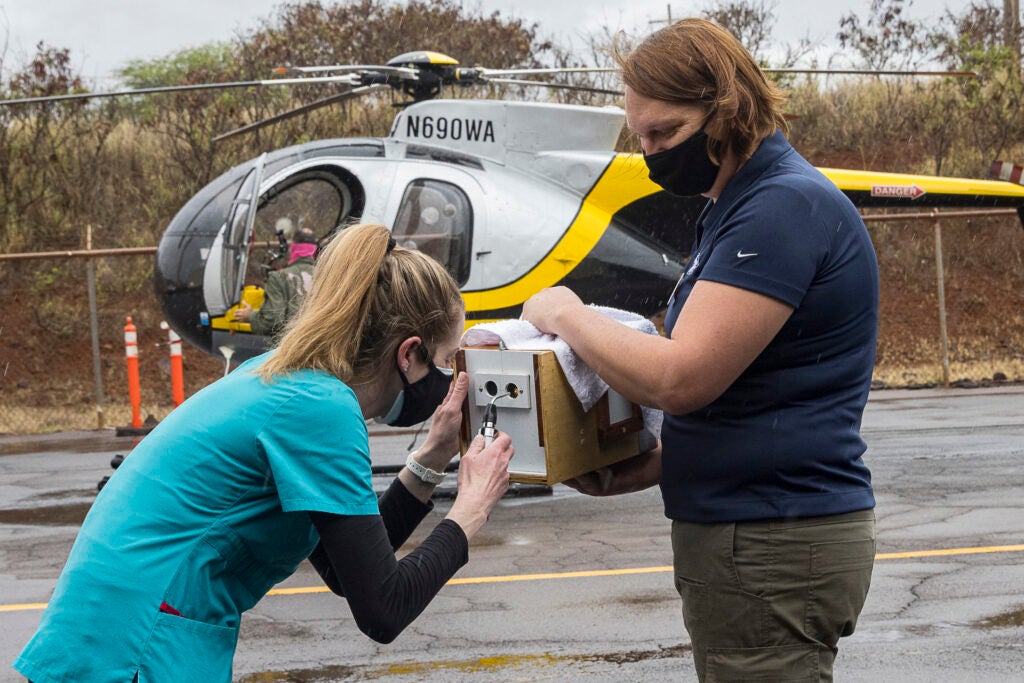 On Dec. 5, a helicopter was dispatched from Maui to Kaua‘i to pick up the bird. After a two-hour flight, it arrived at the Kahului Airport around 1:30 p.m. On the landing pad, SDZWA veterinarian Dr. Deena Brenner peered into the bird’s transport box to give it a quick check, and quietly exclaimed that it appeared to be healthy and well.