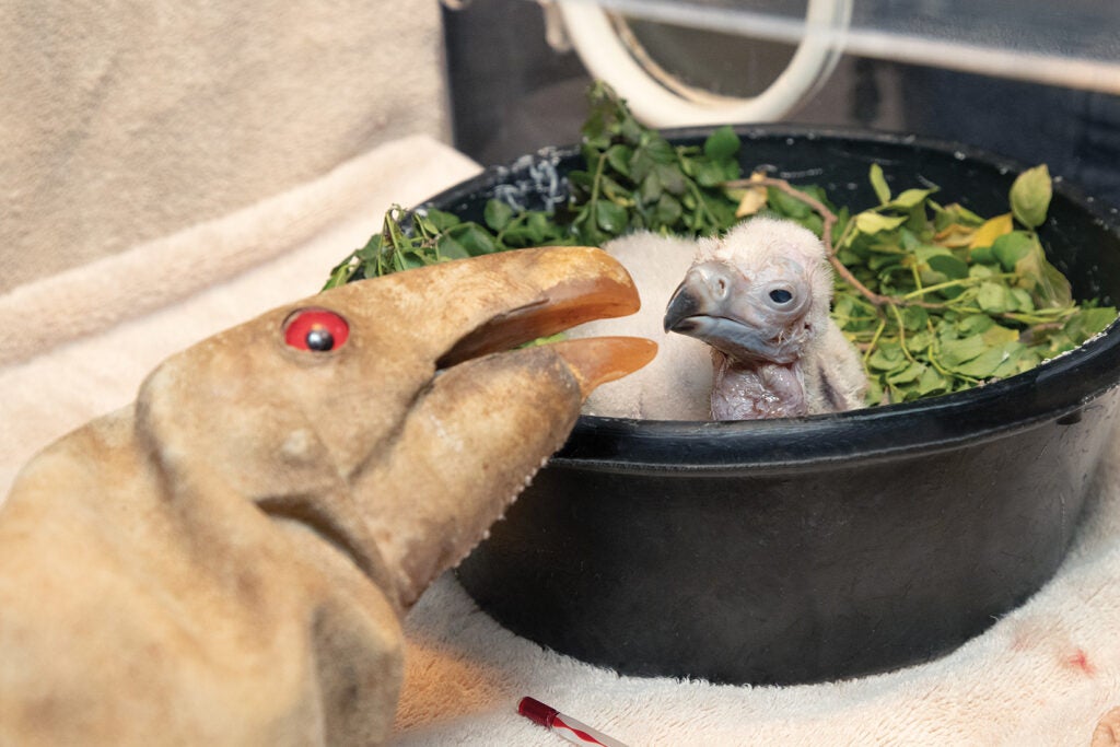 Teengo was quickly settled into her “nest”— a snuggly bowl with warm towels. She was also introduced to her new “mom,” a California condor puppet. We’ve used these puppets for decades to feed our growing condor chicks without the birds seeing their human caretakers in order to give them a more natural upbringing. The puppet completely covers the human hands that provided the daily care this little one needed to grow.