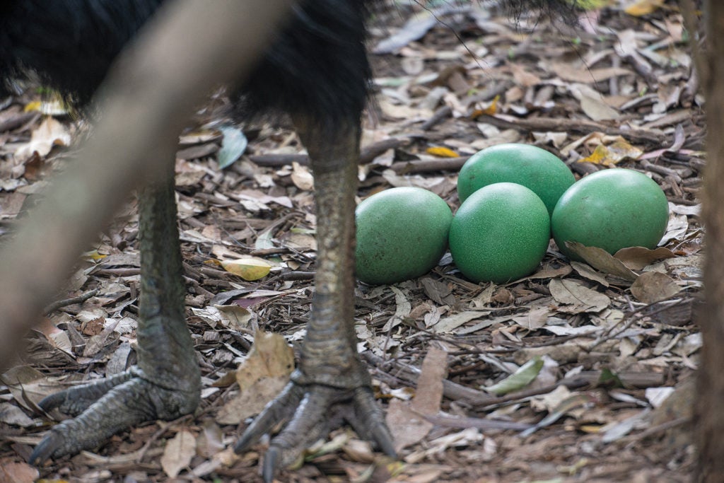 There are three species of this big, beautiful bird that subsists on fruits of several hundred different rain forest plants. But what really takes the cake is the level of care provided by cassowary dads. Once the female lays her three to five, vivid green eggs in a simple nest scraped in the ground, she flounces off back into the forest, leaving the male to incubate the eggs for weeks. Once they hatch, he fiercely protects and devotedly nurtures them for months, all on his own.