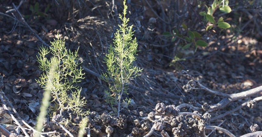 Fire frequency matters. Just look at what could happen to the imperiled Tecate cypress: “If a fire passes through, it would burn adult trees and open their cones,” says Joe. “The seeds drop to the ground and germinate, but they need another 15 to 20 years before they are producing new cones. If another fire comes through and burns young trees before they have the ability to produce cones and seeds, then you’re potentially wiping out the entire population.” That’s exactly what happened when wildfires blazed through San Diego County in 2003 and again in 2007. Tecate cypress seedlings that sprouted after the 2003 fire burned in the 2007 fire—before they were large enough to produce cones of their own.
