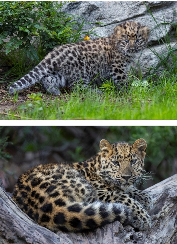 For the first few weeks after their birth, the cubs remained in their den with Satka. Like many cats, Amur leopard cubs are born blind and quite tiny, so during this time the pair grew strong and bonded with mom, who attended to their every need. As the cubs began to emerge from the den and get more adventurous, Satka kept a close eye on the duo, guiding them in the right direction, teaching them, and making sure they didn’t get into too much trouble. Over the course of the year, Satka’s behavior has changed, showing her growing trust with Ulybka and Zorinka as they’ve matured. She engages in less play and has stopped cleaning them so they can learn to manage their own hygiene. These not-so-little cubs are already almost the same size as mom!