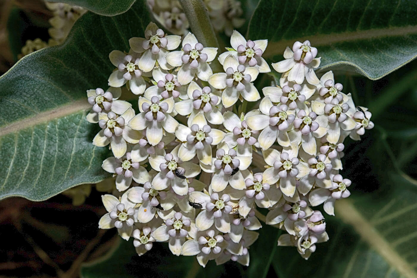 Asclepias eriocarpa (also known as woolypod milkweed) sports oval-shaped leaves and white flowers with a slightly pink hue. Thick white hairs cover the plant from top to bottom, and—true to its name—it produces a woolly fruit.