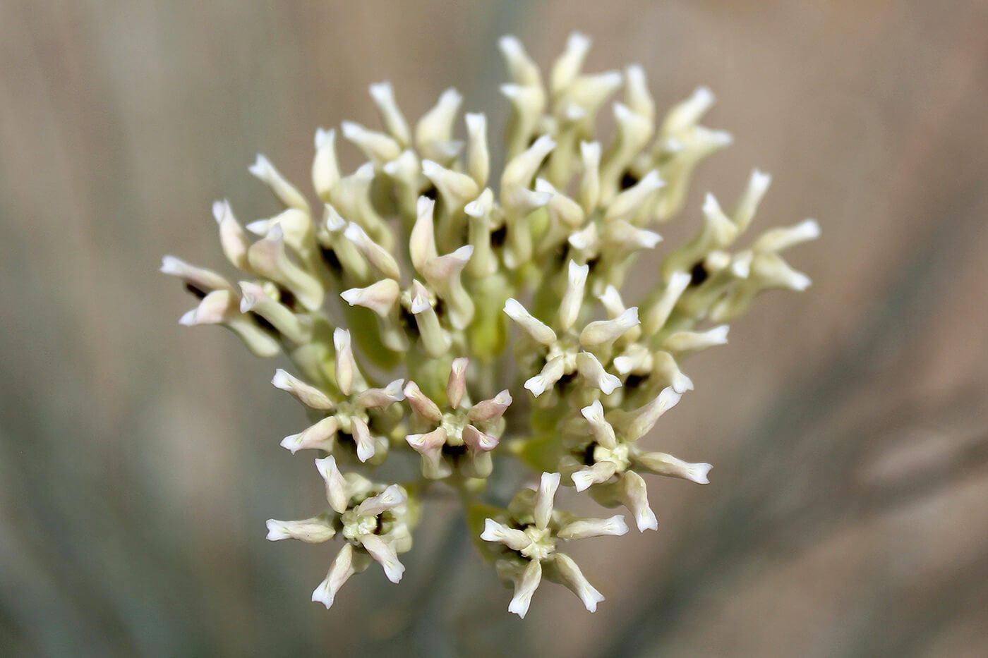 Skeleton milkweed Asclepias subulata loses its leaves earlier in the fall than other milkweed species. Afterward, it appears as a “naked” stalk crowned with a cluster of swooping white flowers that curl back to reveal columns tipped with tiny hooks. Its fruit is pouch-like, with flat, rounded seeds and long, sleek hairs.