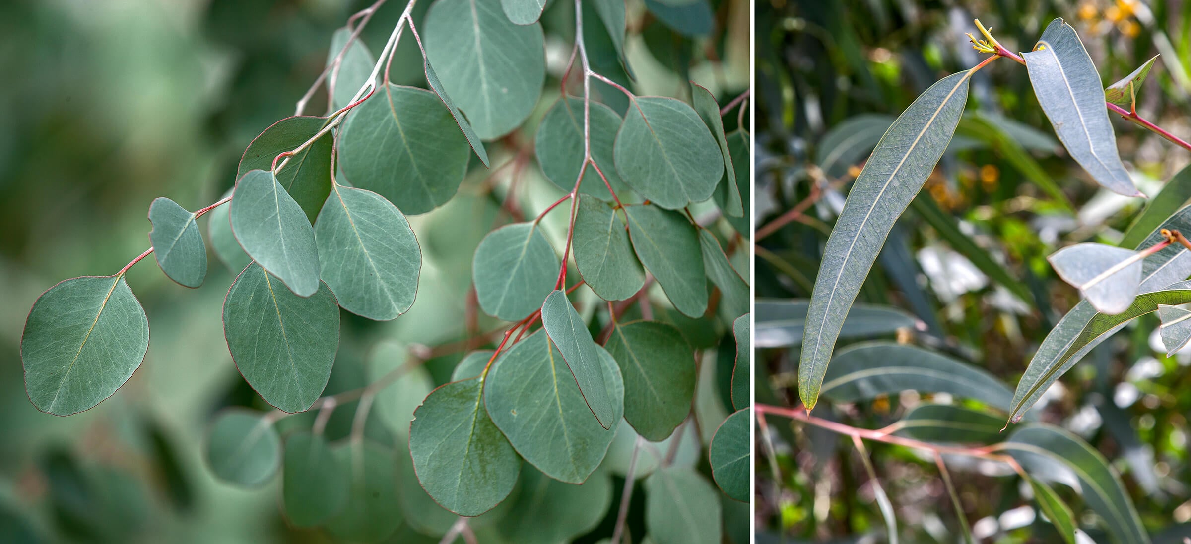LEAF SHAPESIn most gum trees, a mature tree grows long, narrow, straight or sickle-shaped leaves known as adult leaves. A seedling or a sapling grows only juvenile leaves, which are usually rounded, grayish, and powdery. A tree may grow both juvenile leaves (near the base) and adult leaves (at the crown).[/caption]