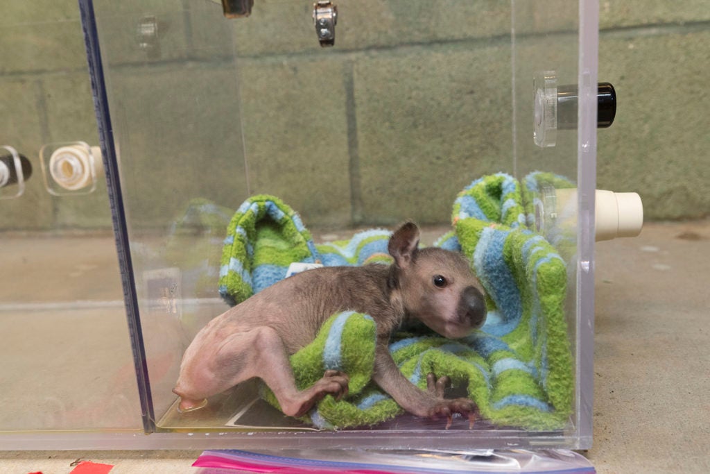 Talk about an underdog—this joey was underweight and under the weather. They even called experts in Australia for tips on feeding joeys this small, since marsupial care runs deep in their blood. They provided some suggestions, but even the Aussies remained skeptical about the outcome for a youngster this little. Staff persisted, keeping a close eye on the joey and feeding him every few hours, around the clock. Becky explained that when they are with their mom, a joey can nurse any time they want, a little at a time, but in a zoo setting, they must eat on a more regimented schedule. The very first bottle the joey got, he slurped it down almost too fast (you never want them to aspirate or blow it out of their nose), so Becky went back to their “nipple arsenal” and used one with a smaller opening for the next feeding. She used the “three point contact hold” when feeding the joey—pinkie under its chin, thumb and index finger smooshing his lips to the bottle to help him latch on. Despite the small victories, they remained guarded.