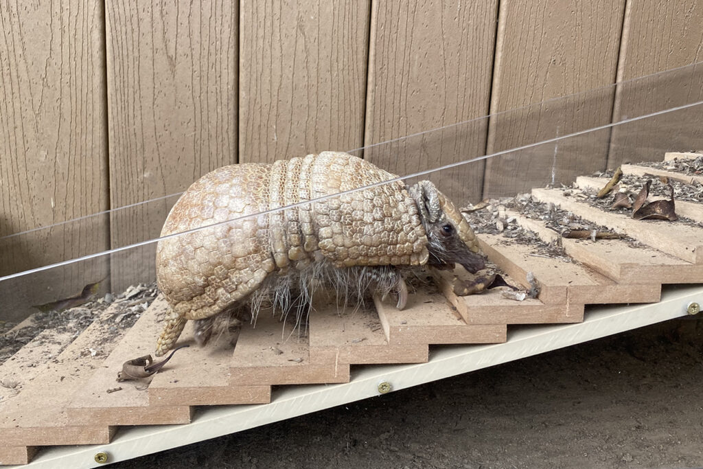Bola the three-banded armadillo exercises on her custom-built staircase to help strengthen her limbs and maintain fluid movements.