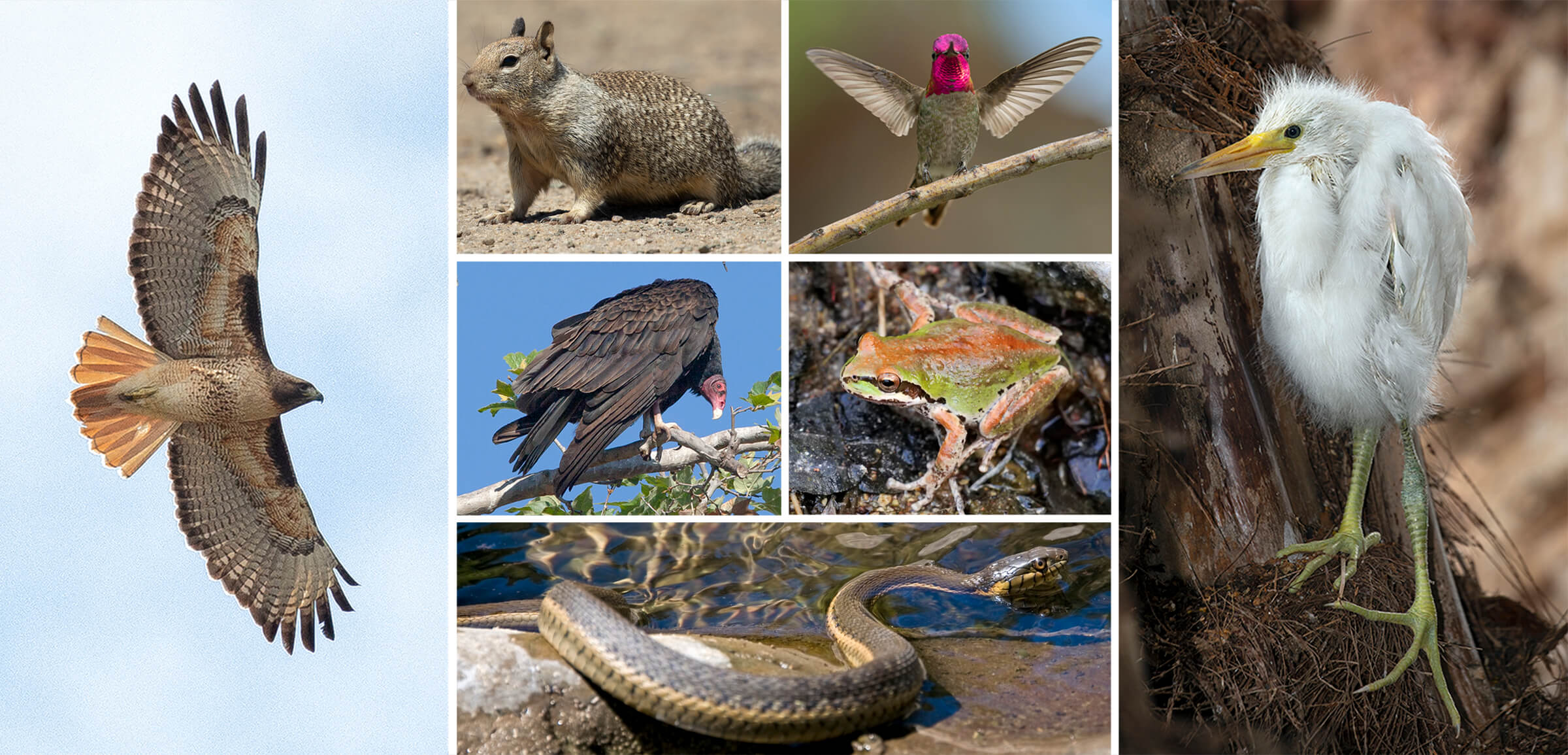 Clockwise from left: red-tailed hawk (Buteo jamaicensis); California ground squirrel (Otospermophilus beecheyi); Anna’s hummingbird (Calypte anna); snowy egret (Egretta thula); two-striped garter snake (Thamnophis hammondii); turkey vulture (Cathartes aura); Baja California treefrog (Pseudacris hypochondriaca hypochondriaca). (Photos by: Tammy Spratt/SDZWA; Ken Bohn/SDZWA; Design Pics/Getty Images; mlharing/Getty Images Plus)