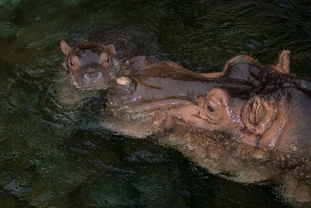 It is important to note that Funani is such a protective and reactive mom that it is imperative for the health and well-being of all involved to keep Otis separated from her while she raises a calf. At birth, a calf can range in weight from 50 to 100 pounds and a protective mom, like Funani, often moves her large, almost 2-ton-body around quickly to ward off any possible threats to the calf; and that movement could result in injury to the little one. It happens in Africa, the native habitat of river hippos, where there is high calf mortality from quick movements by mom or members of their group, which is one theory as to why the river hippo gestation is so short.