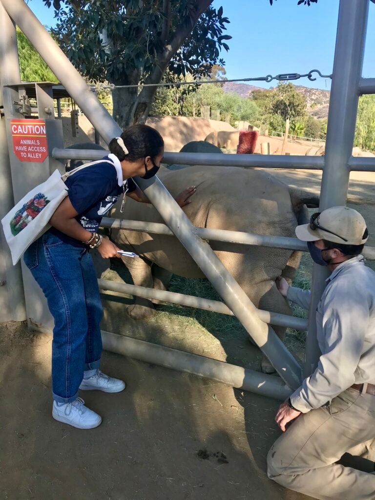 Working at the RRC provides a multitude of amazing experiences and opportunities for Mr. Popichak. With the interns, he recalled one of his best-loved memories working with one of his favorite rhinos, Wallis. When Wallis first arrived at the Safari Park in 2015 from a high-poaching area in South Africa, caretakers detected drainage coming from a tiny hole near her heart. She underwent two operations over the following six months in an attempt to clean up and repair the lesion, but the pin-sized hole would not entirely shut. Wallis' care specialists questioned the cause of the hole until they trained her to stay still for an X-ray using a machine provided to them by the San Diego Fire Rescue Bomb Squad. The squad detected metal fragments in her chest, and with Mr. Popichak at her side, an attending veterinarian was able to use pliers to carefully remove what turned out to be a bullet. Since then, Wallis has been incredibly happy and healthy. It was through this experience that Mr. Popichak got to develop trust in what he describes as the “trust bank account.” This analogy compares the relationship with an animal to a bank account, in that one must invest in their relationship with an animal but also must know when to make withdrawals, essentially meaning a trainer must balance training sessions with an animal’s threshold. With Wallis, he understood that the surgery and the proceeding wound cleaning sessions may have been a lot for her due to her just arriving in a new environment. However, it was through the trust that he built with Wallis in her recovering period that allowed them to make such a strong connection.
