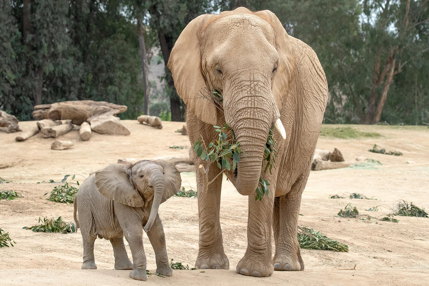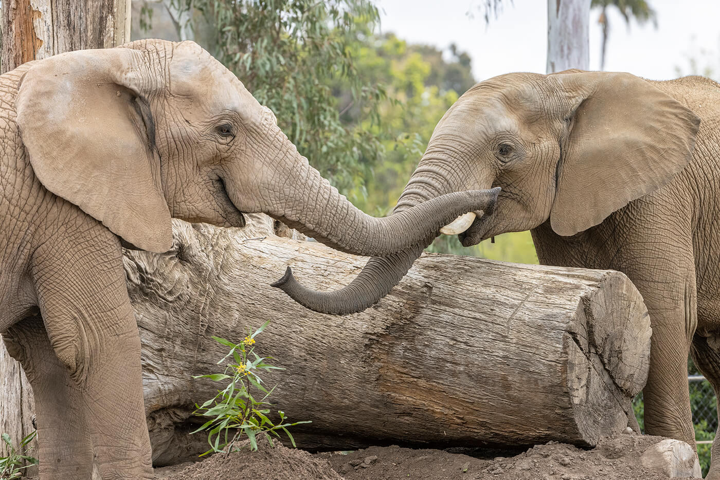 Two juvenile male elephants have recently been paired to form San Diego Zoo’s first bachelor group. Sundzu (whose full name, Tsandzikle, means “beloved” in Siswati) is a 10-year-old that arrived from Reid Park Zoo. He joins his half-brother Nipho (whose full name, Inhlonipho, means “courteous” in Siswati), a nine-year-old born at the San Diego Zoo Safari Park. Females Mary, Devi, and Shaba round out the Zoo's herd. The bulls were introduced in April 2021 at the San Diego Zoo’s Harry and Grace Steele Elephant Odyssey habitat, and they have quickly bonded; the Zoo’s team of elephant care specialists report that they spend their days exploring, sharing food, wallowing in mud together, and even sleeping side by side. “They are highly cooperative as they experience everything in their new environment together,” says Robbie Clark, senior wildlife care specialist.